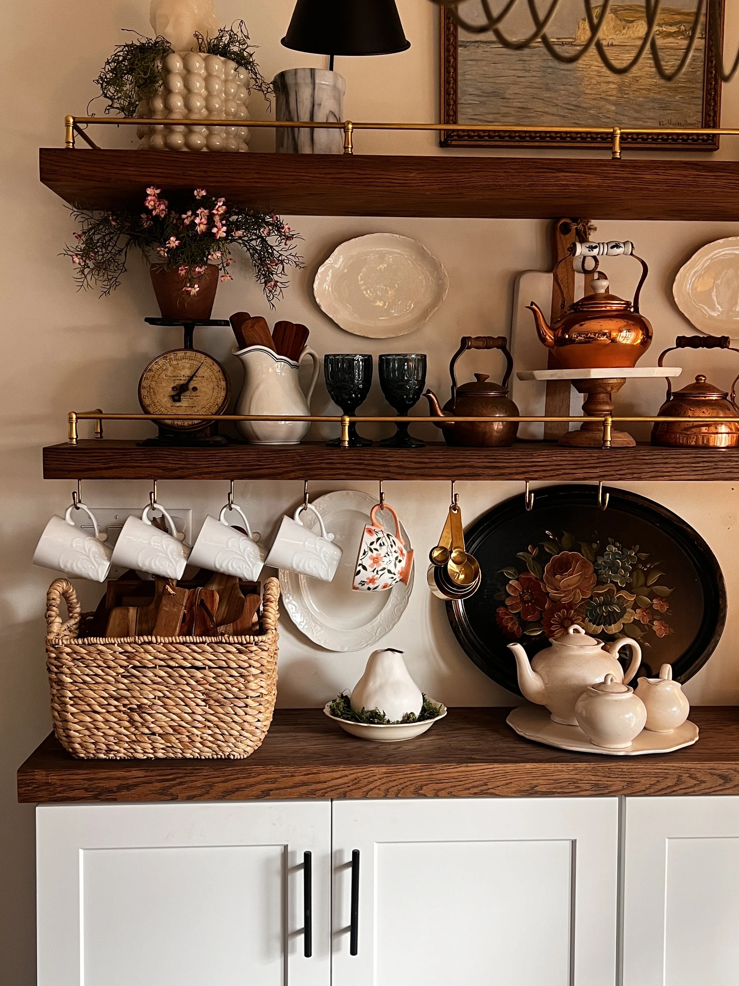 I have been obsessing over the look of brass gallery rails on shelves, but when I started pricing them out—WOW. The cost was way more than I was willing to spend. That’s when my husband (who is super handy) and I started brainstorming ways to achieve the same elegant look for a fraction of the price.